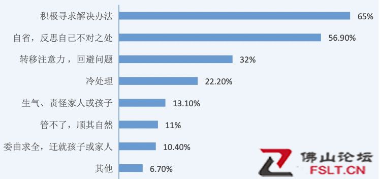《報(bào)告》指出,在家庭教育中遇到棘手問題的多項(xiàng)選擇中,65%的佛山家長(zhǎng)表示愿意積極尋求解決辦法,但仍有32%的家長(zhǎng)表現(xiàn)為回避問題,22%家長(zhǎng)選擇冷處理,有一成左右的家長(zhǎng)選擇了放棄或者在某些情境下有過放任和妥協(xié)的經(jīng)歷。
