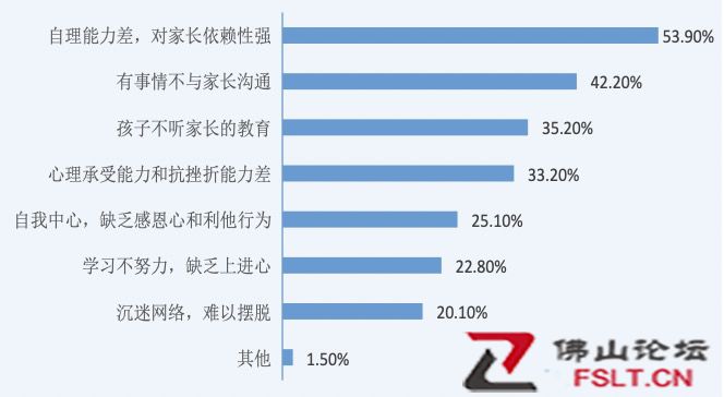 佛山家長(zhǎng)認(rèn)為,家庭教育的主要困難排前三位的依次是 “時(shí)間和精力不夠”、“缺少家庭教育理論知識(shí)”和“不了解當(dāng)今時(shí)代孩子的想法”。同時(shí)“家庭成員教育態(tài)度不一致”、“不了解學(xué)校要求和孩子在校表現(xiàn)”也占有一定比例。
