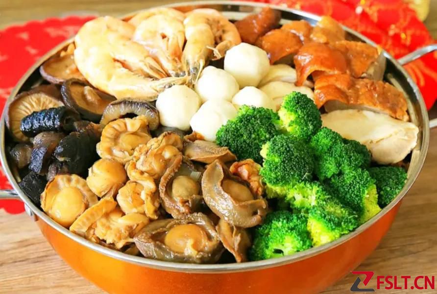 1、根據(jù)自己的喜歡搭配。可用平常家里人喜歡吃的東西來做的,比如鮑魚、海參、鵝掌、白斬雞、燒豬肉、茨菇、蓮藕、花菇、西蘭花、蘿卜水分比較多墊在鍋底就不容易糊底。