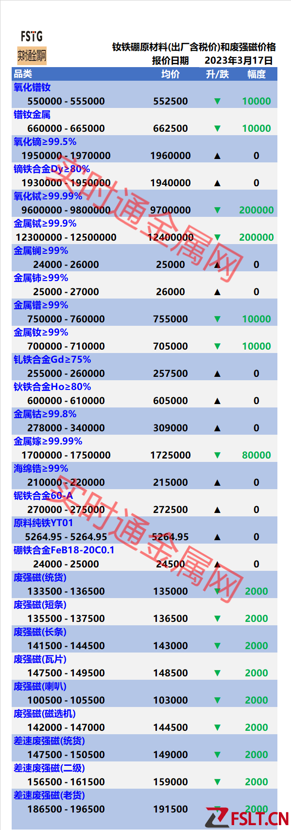 釹鐵硼廢強(qiáng)磁價(jià)格3月17日