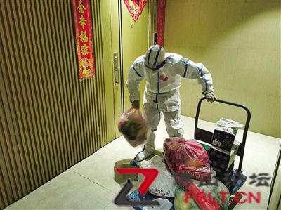 連中新和莫有浩是負(fù)責(zé)2座物資配送的工作人員。11時(shí)左右,其他工作人員將2座的物資搬運(yùn)到樓下的一張桌子上,連中新和莫有浩兩人穿戴好防護(hù)服、口罩和手套后,將物資一一搬上小推車,送到每家每戶門口前,把物資放下后,敲門通知居民出來拿,隨后立即離開,全程不直接接觸。