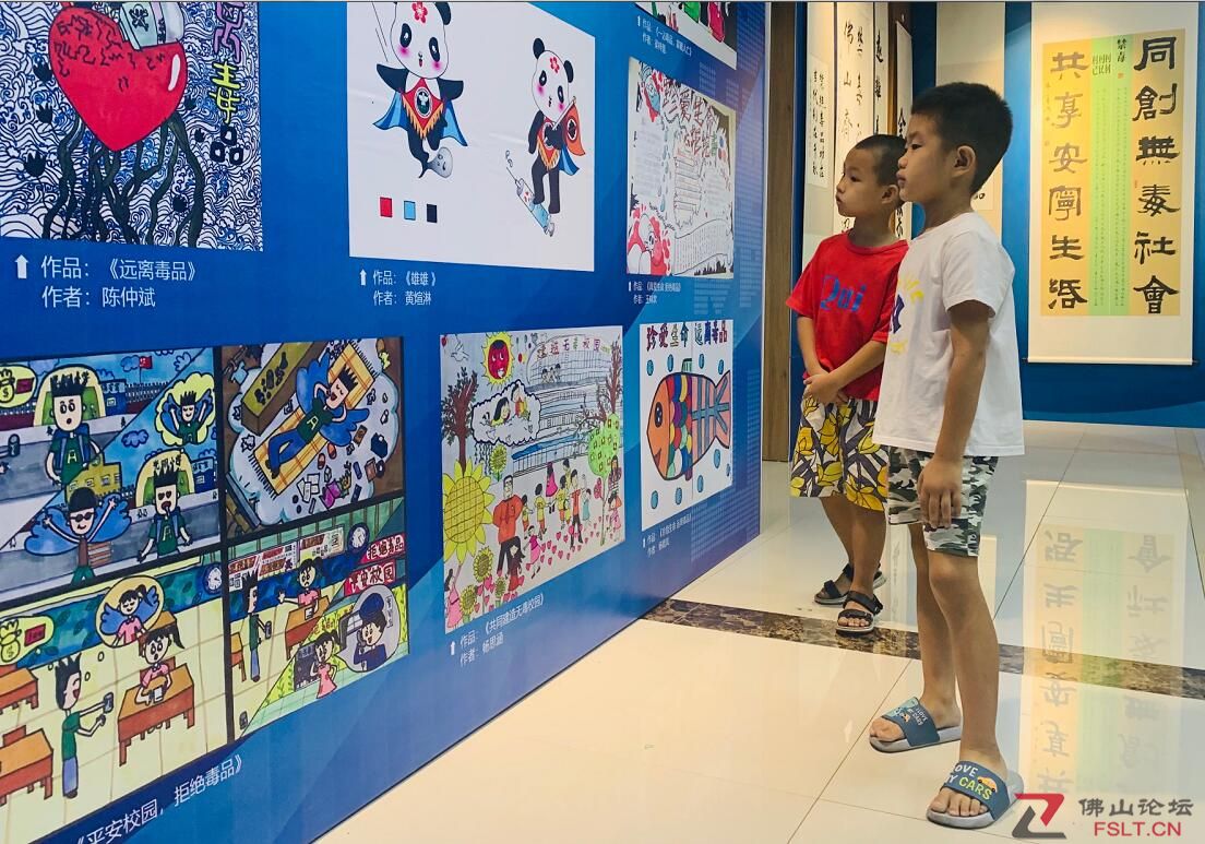 8月25日,佛山禁毒文藝作品巡展上,兩名小男孩在參觀畫作。佛山日?qǐng)?bào)記者王澍攝