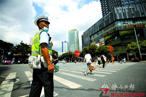 禪城交警陳舒潮在烈日下值守,負(fù)責(zé)在路面整治電動自行車違法行為。/禪城公安供圖