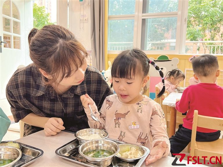 明珠幼兒園老師在照顧孩子吃飯。