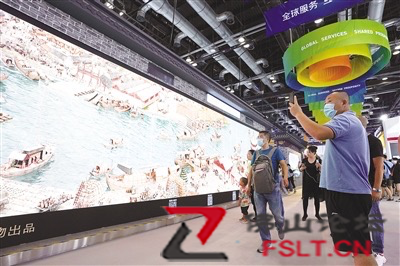 在2020年中國(guó)國(guó)際服務(wù)貿(mào)易交易會(huì)綜合展區(qū),參觀者在參觀展出的《穿越時(shí)空的大運(yùn)河》數(shù)字影像。