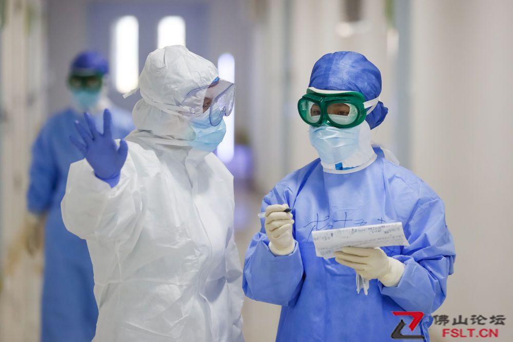 在武漢市金銀潭醫(yī)院的一個病區(qū),金銀潭醫(yī)院護士與浙江省人民醫(yī)院護士(右)交接工作(2020年3月18日攝)。新華社記者 沈伯韓 攝