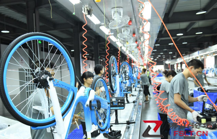 哈啰單車佛山生產基地產線工人生產作業(yè)中。