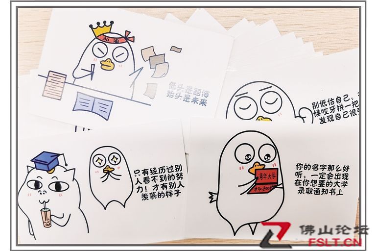 高考前夕,順德一中高三(8)班的每名學生都收到了班主任關嘉欣的手繪明信片。明信片上,關嘉欣畫上高考加油版的網(wǎng)紅表情包“小劉鴨”,鼓勵學生決勝高考。