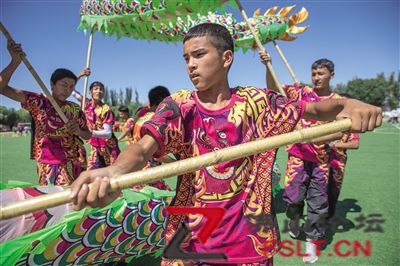 伽師縣英買(mǎi)里鄉(xiāng)中學(xué)學(xué)生在舞龍。/佛山日?qǐng)?bào)記者龍翔攝
