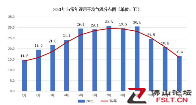 2021年佛山市年平均氣溫24.2℃,較常年明顯偏高1.2℃(常年全市平均氣溫23℃),為1957年有氣象記錄以來最高。除了10月、11月,其余月份平均氣溫都在常年平均值之上,其中3月、5月、9月均刷新了該月平均氣溫最高記錄。