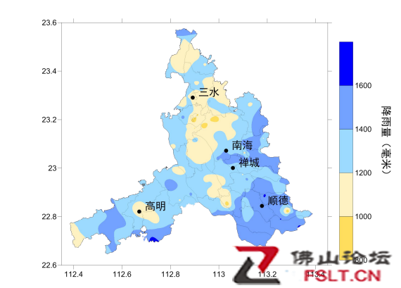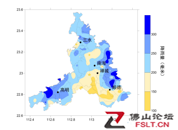 年降水量時(shí)間分布極不均勻,10月異常偏多近1.6倍;降雨量空間分布也不均勻,主要大值區(qū)集中在禪城區(qū)北部、南海區(qū)東部和順德區(qū)中南部。