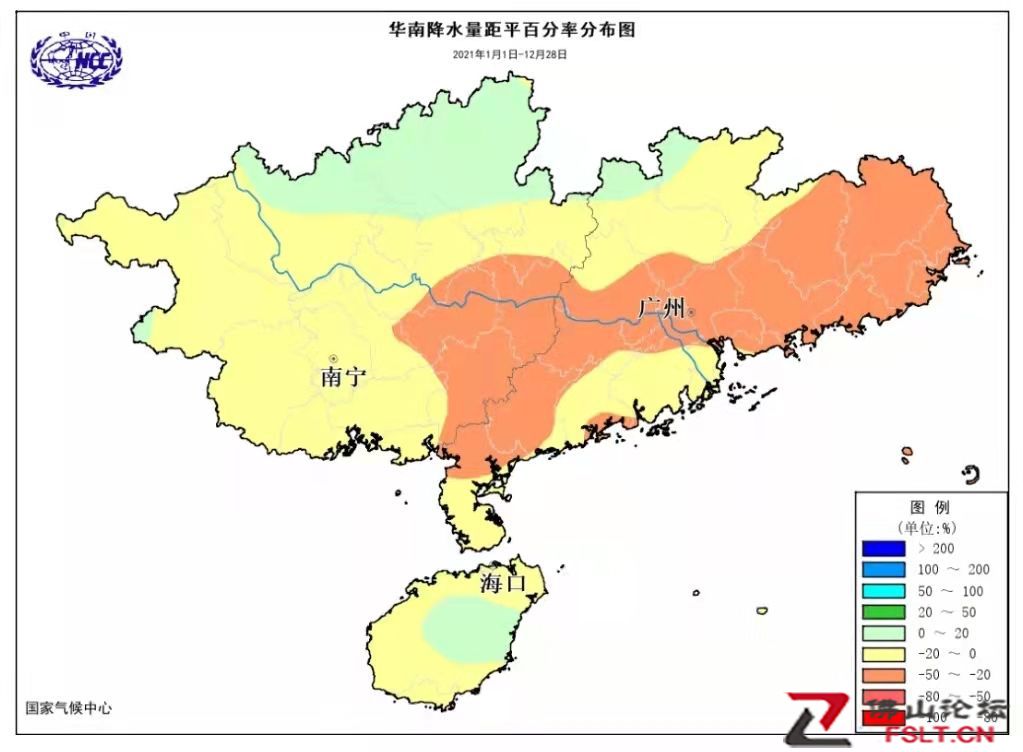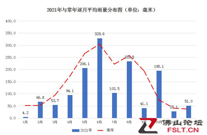 2021年佛山市年降雨量1404.9毫米,較常年偏少21%(常年全市平均降雨量1768.2毫米)。