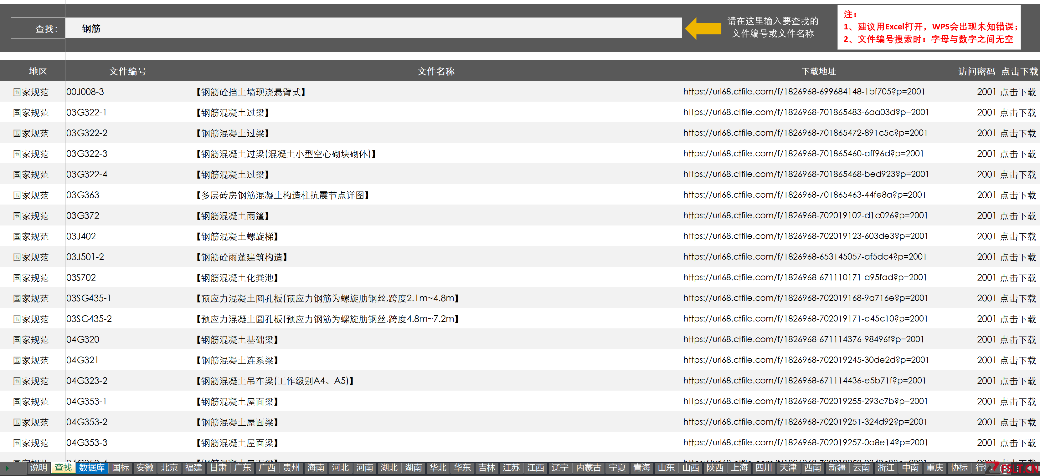 這是目前收集到的廣東地區(qū)的圖集、規(guī)范,不知道有沒有少的,希望大家留言,我好補全。已經(jīng)把所有資料打包成了Excel文件,順便制作了一個可以查詢的功能,WPS用起來還是比較不友好,所以如果需要,私信留郵箱,所有的下載密碼都是:2001,目前總共收錄了9823份文件,希望可以幫到大家