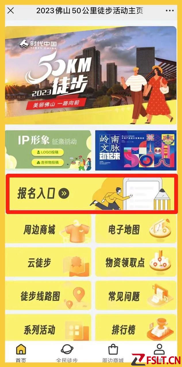 從佛山+客戶端首頁進(jìn)入佛山50KM徒步主題頁,點(diǎn)擊下圖所示【報(bào)名入口】,開始報(bào)名。