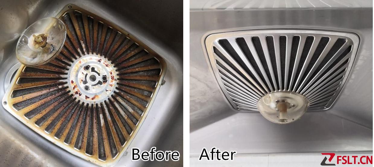 經(jīng)常做飯的廚房油煙比較多,大概1~2個月清潔一次就可以了。使用「油污清潔劑」要比熱水+洗潔精輕松許多,即使是頑固的重油垢,噴上去過幾分鐘后就會慢慢分解,再用清潔海綿擦洗就變干凈了。