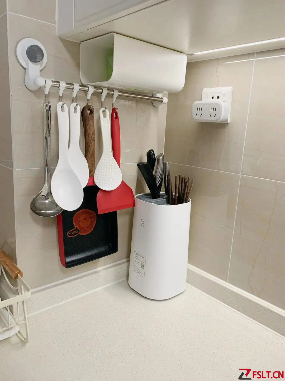 櫥柜拐角位置安裝了吸盤式掛桿,用來收納常用的廚具小用品,屋主還貼心地添置了一個消毒刀筷架,既能收納又能烘干消毒,每次使用都更加安心。
