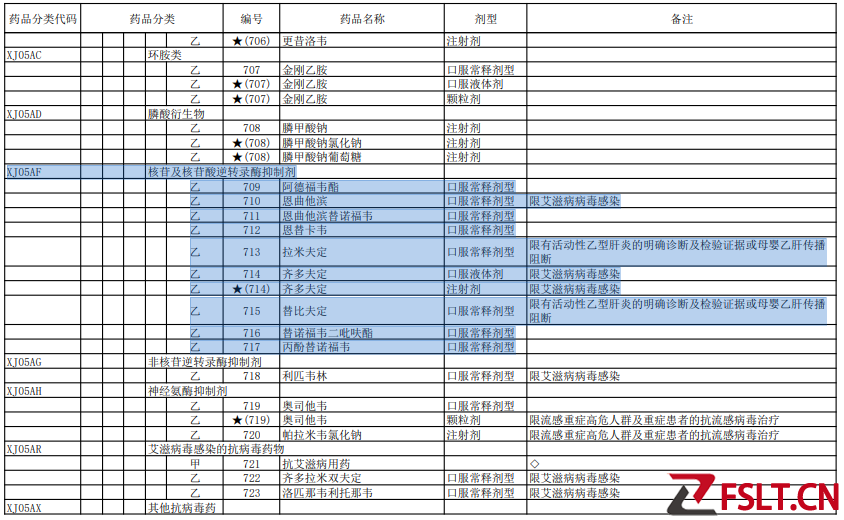 西藥部分(藥品分類代碼XJ05AF)7種:阿德福韋酯,恩曲他濱替諾福韋,恩替卡韋,拉米夫定,替比夫定,替諾福韋二吡呋酯,丙酚替諾福韋