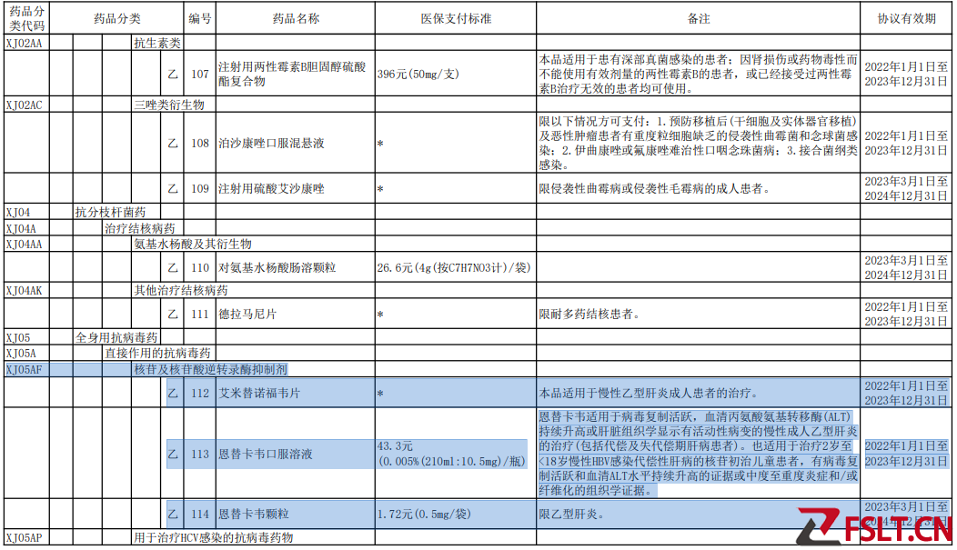 協(xié)議期內(nèi)國家談判藥品部分(藥品分類代碼XJ05AF)3種:艾米替諾福韋片,恩替卡韋口服溶液,恩替卡韋顆粒