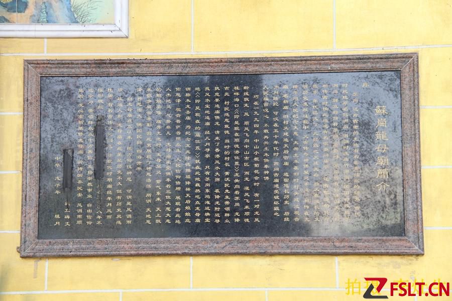 巧在一九九四年,中山小欖菊花會(huì)時(shí)。有一對(duì)龍風(fēng)斷線飄走,風(fēng) 顧鳳飛向中山市區(qū),而龍逆風(fēng)飛來(lái)順的桂畔海口《即是現(xiàn)在順德港位置》,龍頭向著蘇崗,龍降吉兆,村民感恩戴德,當(dāng)時(shí)的村長(zhǎng) 黃沃民先生帶領(lǐng)群眾執(zhí)意要造廟供龍,請(qǐng)來(lái)了香港風(fēng)水大師,在降龍附近尋找風(fēng)水寶地造廟,經(jīng)幾月引察,只有蘇崗東雞灘這塊寶地“即是現(xiàn)在的廟位置”,就在此地巍然屹立龍母廟,謂稱木龍圣廟,