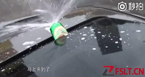 將罐裝啤酒探出天窗外,天窗閉合時(shí),啤酒罐被夾扁,啤酒噴涌而出。