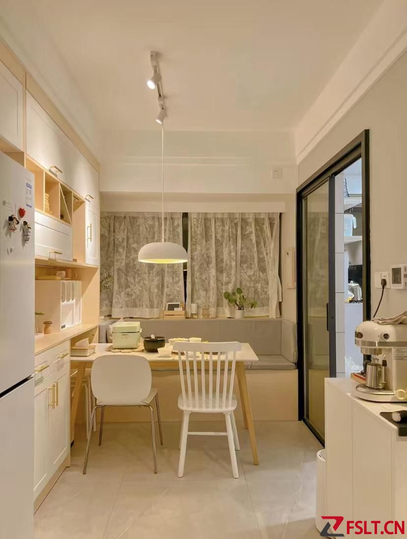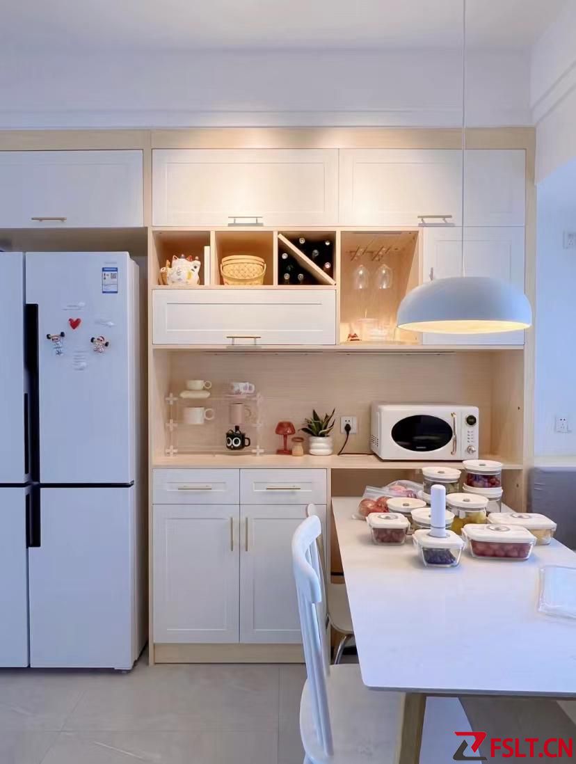 這么小的餐廳,有收納儲(chǔ)物功能的餐邊柜,1.4米長(zhǎng)的大餐桌,還放下了雙開(kāi)門大冰箱,空間一點(diǎn)也不擁擠。