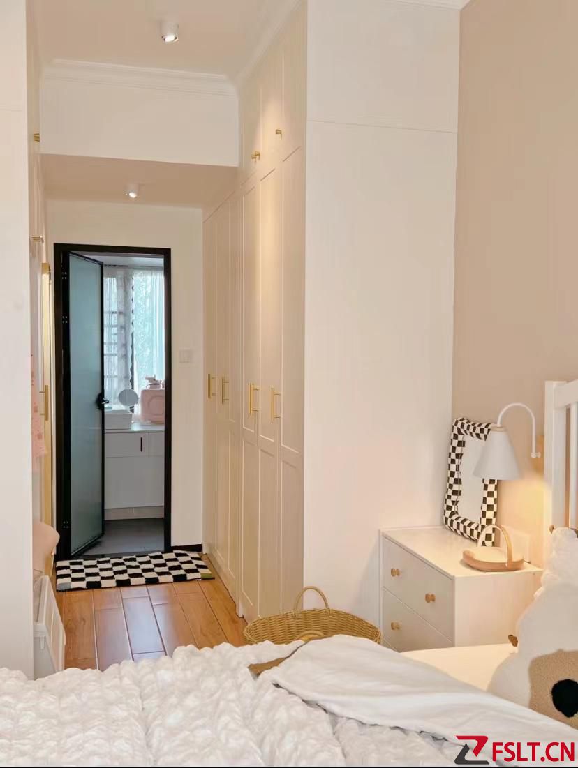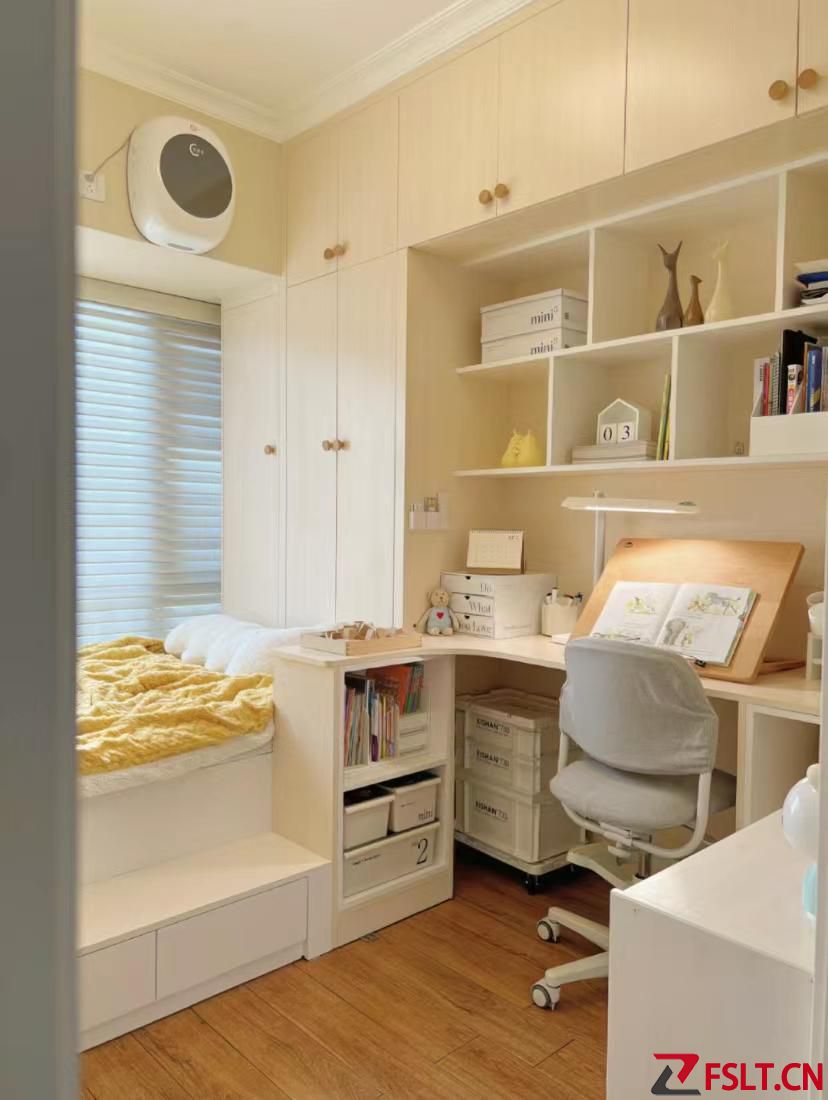 小臥室只有7平多,還有一個(gè)不能拆除的飄窗,因?yàn)榕骷矣质切粜停幌肜速M(fèi)飄窗空間,所以就利用飄窗做了床衣柜書桌一體的設(shè)計(jì),對(duì)于這種小戶型來(lái)說(shuō)很實(shí)用。