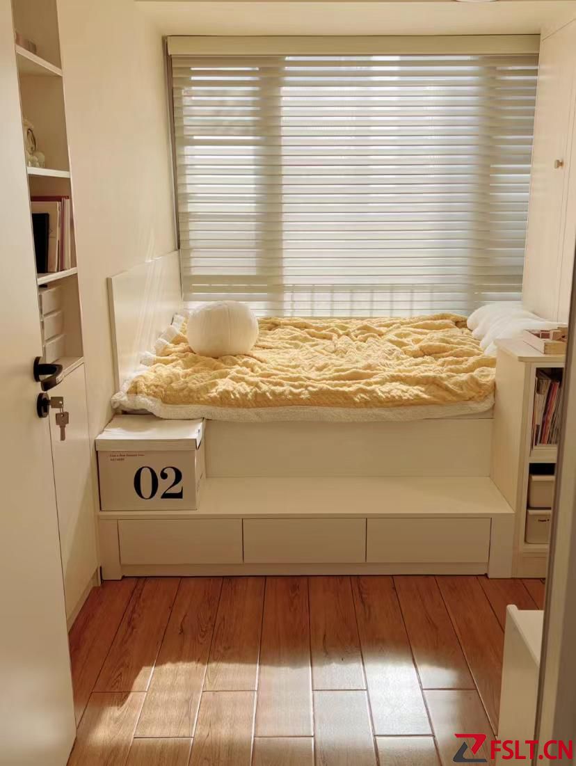床的尺寸是1.35*1.9米。放了一張1.2米寬的床墊,里面留了15cm寬的窗簾寬度。床里面一半是飄窗,外面一半做了三個(gè)大盒子收納一些不常用的東西,根本不用擔(dān)心不方便拿東西。