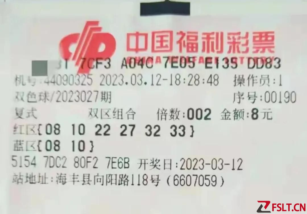 據(jù)媒體報道,在福彩雙色球游戲第23027期開獎中,當期全國共開出了5注一等獎,單注獎金為840萬余元,廣東省汕尾市海豐縣向陽路118號的福彩投注站獨攬了其中2注大獎,中獎彩票是一張經(jīng)2倍投注、僅8元投入的6+2復式倍投票,憑此票收獲獎金累計高達1730萬余元。