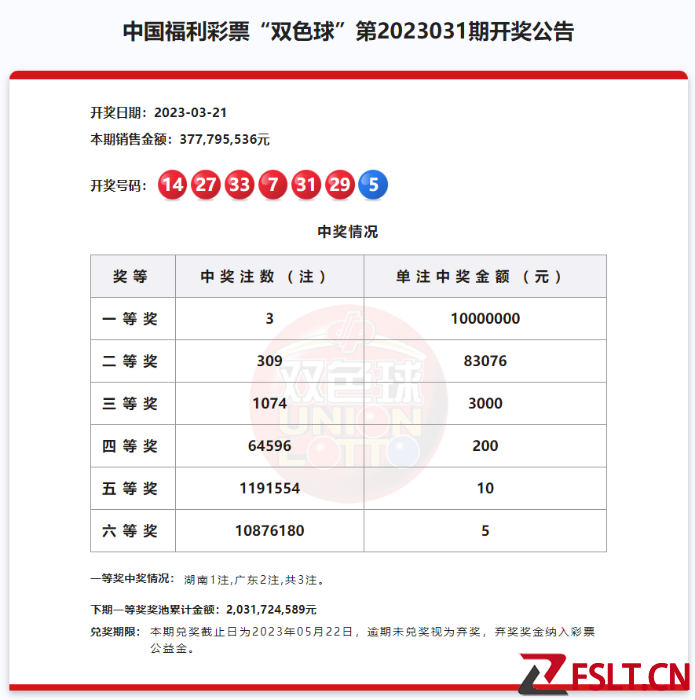 3月21日晚,中國福利彩票雙色球游戲進行第2023031期開獎。當期雙色球紅球號碼為07、14、27、29、31、33,藍球號碼為05。