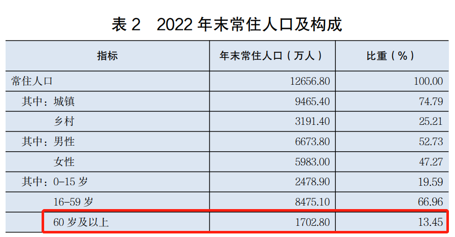 根據(jù)《2022年廣東國民經(jīng)濟和社會發(fā)展統(tǒng)計公報》:2022 年末,全省常住人口 12656 萬人,其中城鎮(zhèn)常住人口 9465萬人,占比74.79%。60歲及以上人口為1702萬人,占13.45%。從上述數(shù)據(jù)中可以推測:在廣東省,每100人當(dāng)中,60歲及以上的,有13人。