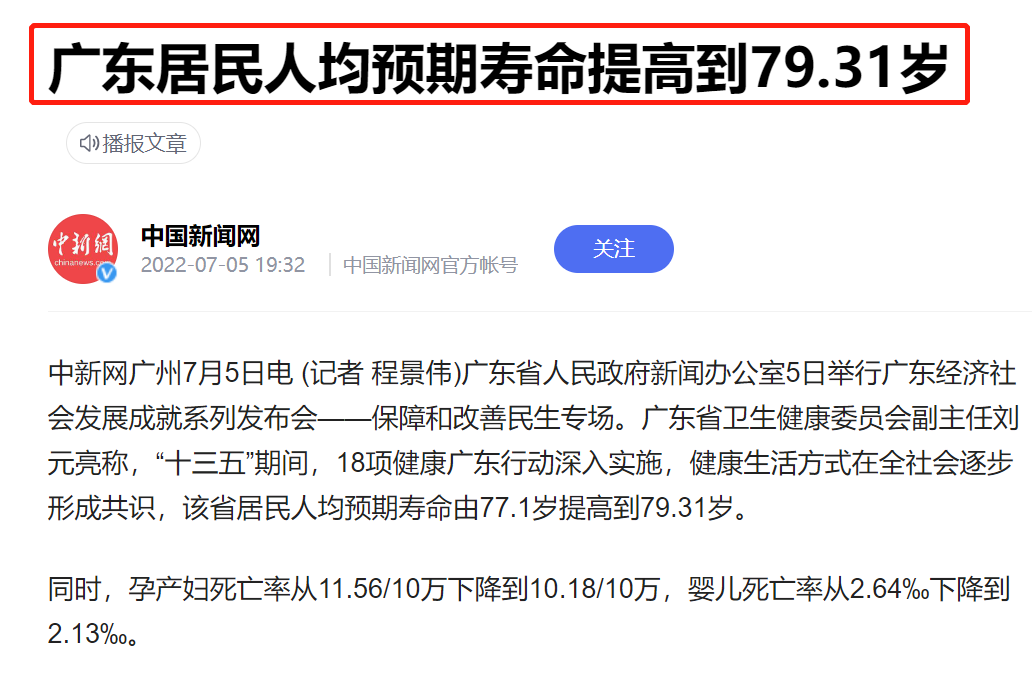 根據(jù)廣東省衛(wèi)健委發(fā)布的數(shù)據(jù)顯示:十三五期間,廣東省開展18項健康廣東行動,全省人均預(yù)期壽命達(dá)到79.31歲。在全國范圍內(nèi),屬于高水平。