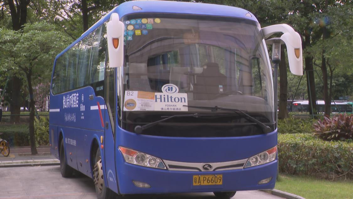 擺放著廣交會酒店車臨停證的大巴車停放在酒店門前。