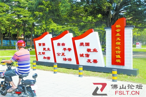 社會主義核心價值觀標(biāo)語設(shè)置在高明大大小小的公園內(nèi)。