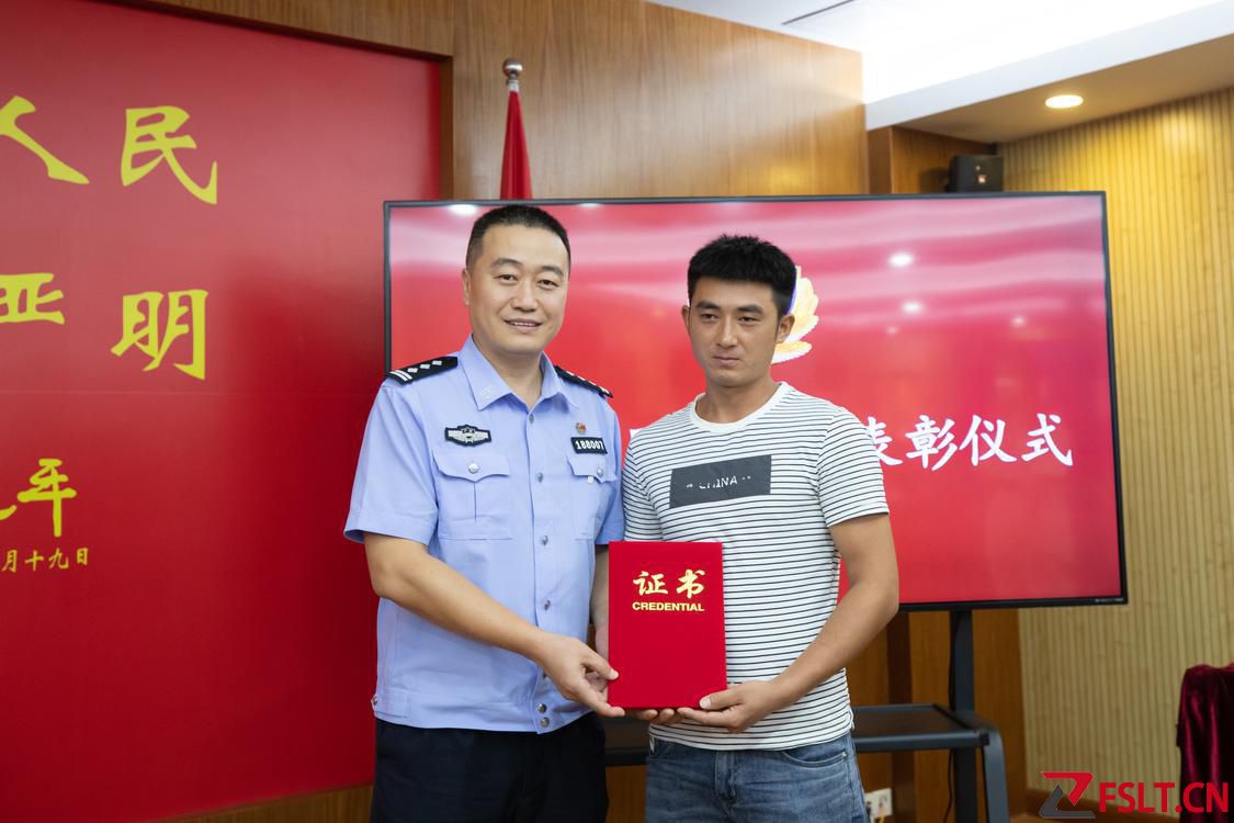 高明區(qū)公安分局副局長徐彭向余森頒發(fā)了見義勇為行為確認證明書。