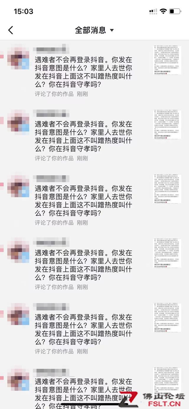 相關(guān)截圖顯示,有網(wǎng)友反復(fù)刷屏評論稱,“家里人去世你發(fā)在抖音上面這不叫蹭熱度叫什么?你在抖音守孝嗎?”也有網(wǎng)友私信罵道,“蹭熱度不讓人說啊?”