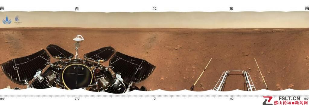 著陸點(diǎn)全景圖,是火星車尚未駛離著陸平臺(tái)時(shí),由火星車桅桿上的導(dǎo)航地形相機(jī),進(jìn)行 360° 環(huán)拍,經(jīng)過校正和鑲嵌拼接而成。圖像顯示,著陸點(diǎn)附近地勢(shì)平坦,遠(yuǎn)處可見火星地平線,石塊豐度和尺寸與預(yù)期一致,表明著陸點(diǎn)自主選擇和懸停避障實(shí)施效果良好。