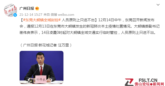 12月14日中午,東莞召開新聞發(fā)布會,通報12月13日在東莞市大朗鎮(zhèn)發(fā)生的新冠肺炎本土疫情處置情況。大朗鎮(zhèn)委副書記謝偉良表示,14日凌晨0時起對大朗鎮(zhèn)全域交通實行臨時管控,人員原則上只進(jìn)不出。