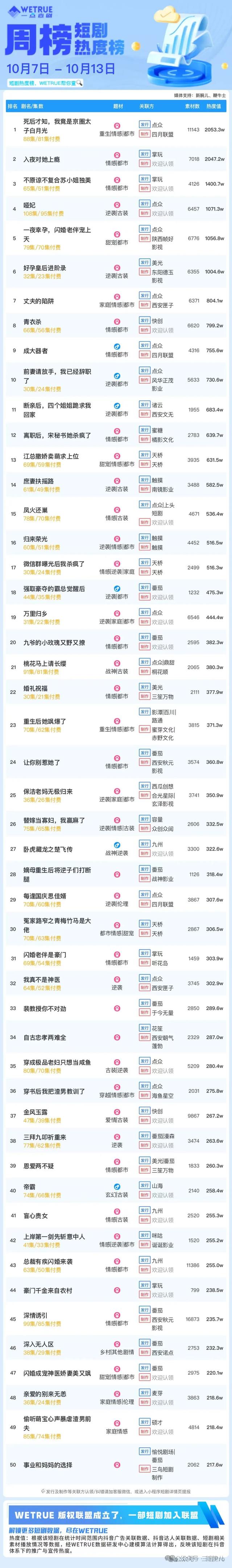 新腕兒、鞭牛士聯合WETRUE一點查劇共同推出10月第2周短劇熱度周榜,榜單顯示《一夜幸孕,閃婚老伴寵上天》排名第5?!侗嵃⒁虩o極歸來》榜上有名,排名第25。此外還有《閃婚老伴是豪門》在榜。