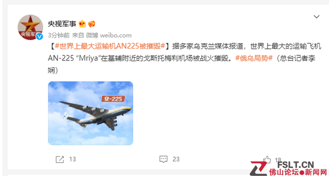 據(jù)多家烏克蘭媒體報道,世界上最大的運輸飛機(jī)AN-225 “Mriya”在基輔附近的戈斯托梅利機(jī)場被戰(zhàn)火摧毀。