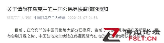中新網(wǎng)3月7日日電 據(jù)中國(guó)駐烏克蘭大使館官方微信公眾號(hào)消息,目前,在烏克蘭的中國(guó)同胞絕大部分已撤離。當(dāng)前,烏緊張形勢(shì)還在不斷惡化,且有急劇升溫之勢(shì),中國(guó)駐烏克蘭使館在此謹(jǐn)提醒尚在烏的中國(guó)同胞盡快自烏離境。