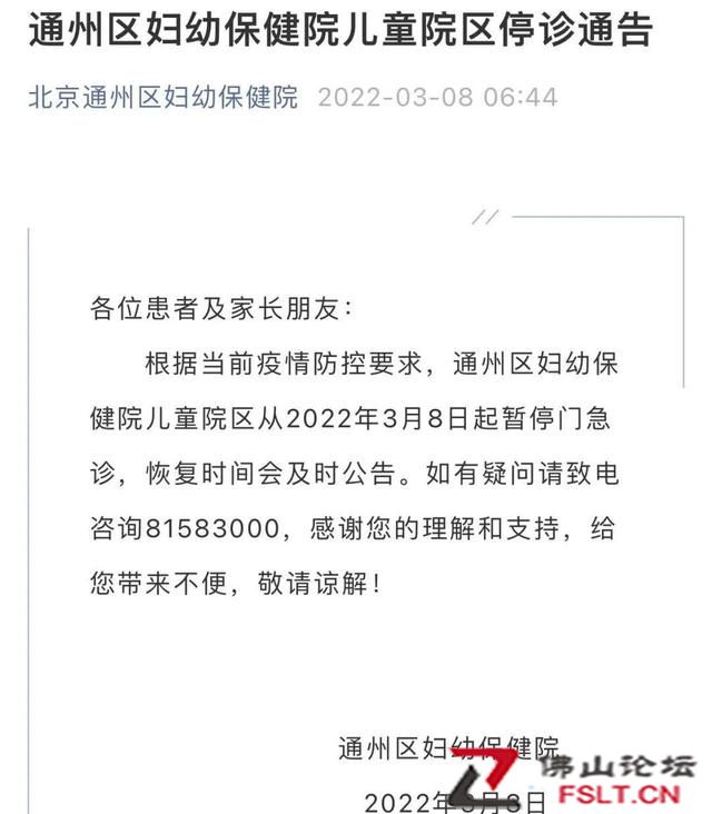 此前,據(jù)“北京通州區(qū)婦幼保健院”微信號,3月8日,北京市通州區(qū)婦幼保健院發(fā)布公告稱,根據(jù)當前疫情防控要求,通州區(qū)婦幼保健院兒童院區(qū)從2022年3月8日起暫停門急診,恢復(fù)時間會及時公告。