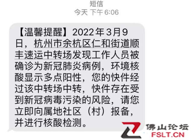 2022年3月9日,杭州市余杭區(qū)仁和街道順豐速運(yùn)中轉(zhuǎn)場(chǎng)發(fā)現(xiàn)工作人員被確診為新冠肺炎病例,環(huán)境核酸顯示有多點(diǎn)陽(yáng)性,您的快件經(jīng)過(guò)該中轉(zhuǎn)場(chǎng)中轉(zhuǎn),快件存在受到新冠病毒污染的風(fēng)險(xiǎn),請(qǐng)您立即向?qū)俚厣鐓^(qū)(村)報(bào)備,并進(jìn)行核酸檢測(cè)。