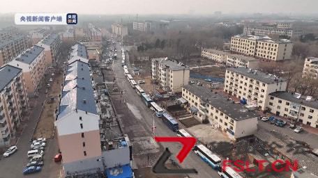 記者通過航拍看到,學(xué)生們在操場集合后帶著行李穿著防護服,排隊分批次上車,等待轉(zhuǎn)運
