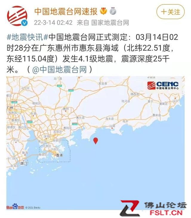 中國(guó)地震臺(tái)網(wǎng)正式測(cè)定:03月14日02時(shí)28分在廣東惠州市惠東縣海域(北緯22.51度,東經(jīng)115.04度)發(fā)生4.1級(jí)地震,震源深度25千米。