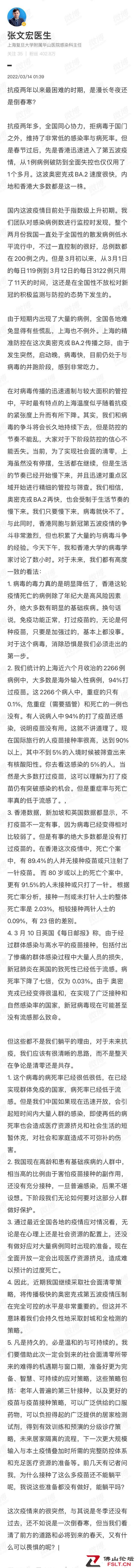 3月14日,國家傳染病醫(yī)學(xué)中心主任、上海復(fù)旦大學(xué)附屬華山醫(yī)院感染科主任張文宏微博再發(fā)千字長文解析疫情,全文如下: