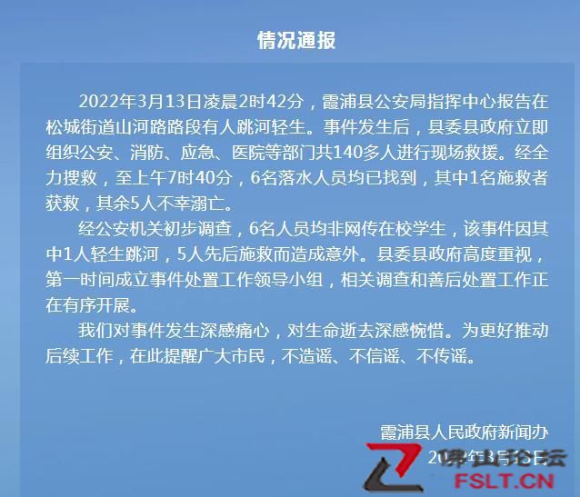 2022年3月13日凌晨2時(shí)42分,霞浦縣公安局指揮中心報(bào)告在松城街道山河路路段有人跳河輕生。事件發(fā)生后,縣委縣政府立即組織公安、消防、應(yīng)急、醫(yī)院等部門共140多人進(jìn)行現(xiàn)場(chǎng)救援。經(jīng)全力搜救,至上午7時(shí)40分,6名落水人員均已找到,其中1名施救者獲救,其余5人不幸溺亡。