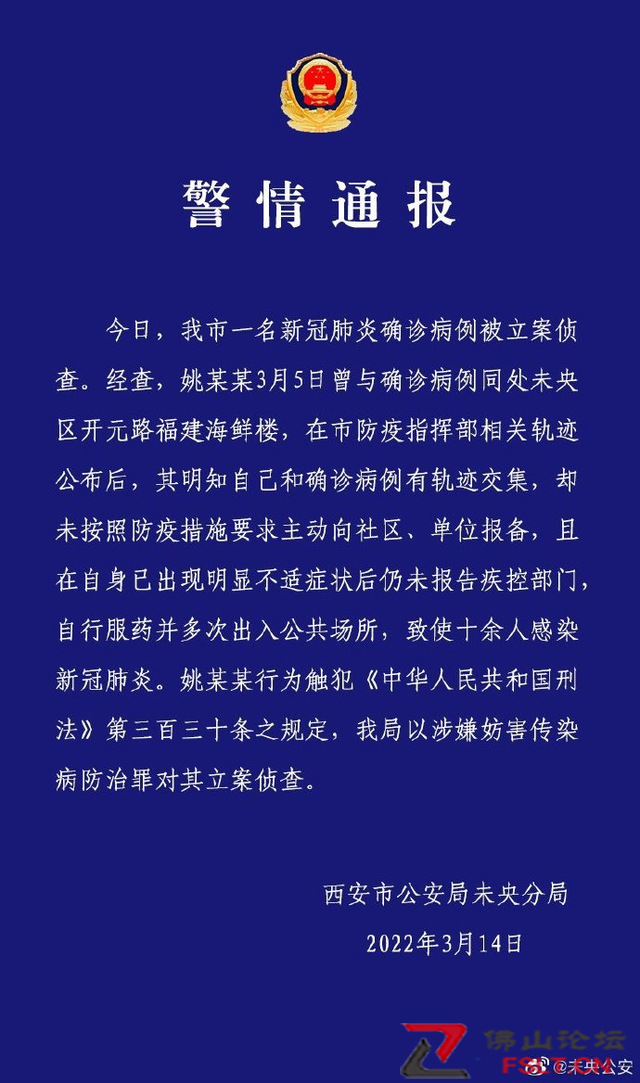 據(jù)西安市疫情防控指揮部消息,3月15日,西安市1名新冠肺炎確診病例姚某某被立案?jìng)刹?。?jīng)查,姚某某3月5日曾與確診病例同處西安市未央?yún)^(qū)開元路福建海鮮樓,在西安市防疫指揮部相關(guān)軌跡公布后,其明知自己和確診病例有軌跡交集,卻未按照防疫措施要求主動(dòng)向社區(qū)、單位報(bào)備,且在自身已出現(xiàn)明顯不適癥狀后仍未報(bào)告疾控部門,自行服藥并多次出入公共場(chǎng)所,致使十余人感染新冠肺炎。姚某某行為觸犯《中華人民共和國刑法》第三百三十條之規(guī)定,西安市公安局未央分局以涉嫌妨害傳染病防治罪對(duì)其立案?jìng)刹椤?/p>