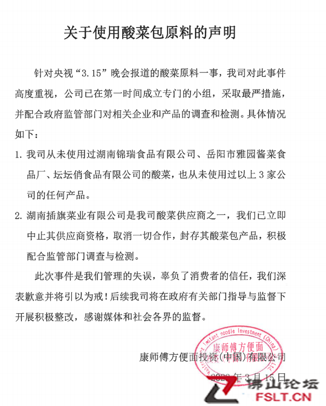 康師傅就“土坑酸菜”致歉,已取消與插旗菜業(yè)一切合作