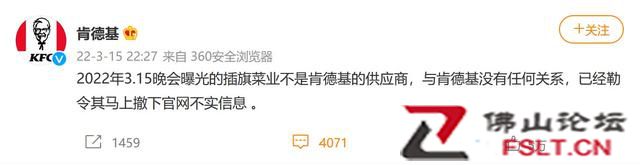 3月15日晚,肯德基回應(yīng)稱,被曝光的插旗菜業(yè)不是公司供應(yīng)商,與公司沒有任何關(guān)系,已經(jīng)勒令其馬上撤下官網(wǎng)不實信息。