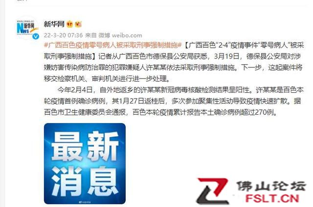 【廣西百色“2·4”疫情事件“零號病人”被采取刑事強制措施】記者從廣西百色市德??h公安局獲悉,3月19日,德??h公安局對涉嫌妨害傳染病防治罪的犯罪嫌疑人許某某依法采取刑事強制措施。下一步,這起案件將移交檢察機關、審判機關進行進一步處理。